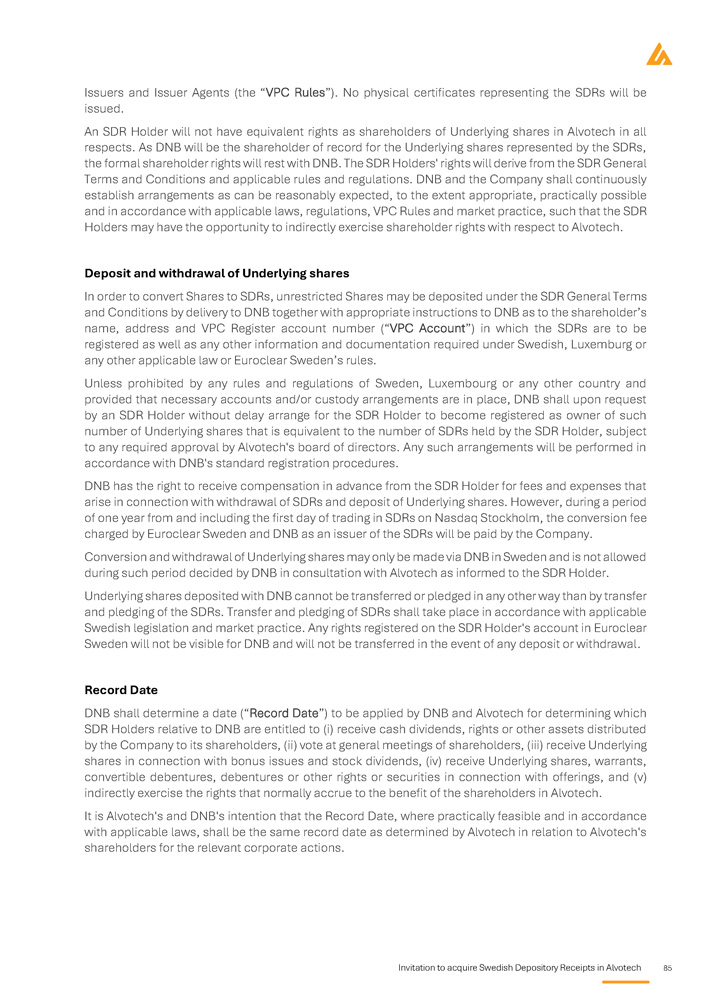 Invitation to acquire Swedish Depository Receipts in Alvotech 85 Issuers and Issuer Agents (the “VPC Rules”). No physical certificates representing the SDRs will be issued. An SDR Holder will not have equivalent rights as shareholders of Underlying shares in Alvotech in all respects . As DNB will be the shareholder of record for the Underlying shares represented by the SDRs, the formal shareholder rights will rest with DNB . The SDR Holders' rights will derive from the SDR General Terms and Conditions and applicable rules and regulations . DNB and the Company shall continuously establish arrangements as can be reasonably expected, to the extent appropriate, practically possible and in accordance with applicable laws, regulations, VPC Rules and market practice, such that the SDR Holders may have the opportunity to indirectly exercise shareholder rights with respect to Alvotech . Deposit and withdrawal of Underlying shares In order to convert Shares to SDRs, unrestricted Shares may be deposited under the SDR General Terms and Conditions by delivery to DNB together with appropriate instructions to DNB as to the shareholder’s name, address and VPC Register account number (“VPC Account”) in which the SDRs are to be registered as well as any other information and documentation required under Swedish, Luxemburg or any other applicable law or Euroclear Sweden’s rules . Unless prohibited by any rules and regulations of Sweden, Luxembourg or any other country and provided that necessary accounts and/or custody arrangements are in place, DNB shall upon request by an SDR Holder without delay arrange for the SDR Holder to become registered as owner of such number of Underlying shares that is equivalent to the number of SDRs held by the SDR Holder, subject to any required approval by Alvotech's board of directors . Any such arrangements will be performed in accordance with DNB's standard registration procedures . DNB has the right to receive compensation in advance from the SDR Holder for fees and expenses that arise in connection with withdrawal of SDRs and deposit of Underlying shares . However, during a period of one year from and including the first day of trading in SDRs on Nasdaq Stockholm, the conversion fee charged by Euroclear Sweden and DNB as an issuer of the SDRs will be paid by the Company . Conversion and withdrawal of Underlying shares may only be made via DNB in Sweden and is not allowed during such period decided by DNB in consultation with Alvotech as informed to the SDR Holder . Underlying shares deposited with DNB cannot be transferred or pledged in any other way than by transfer and pledging of the SDRs . Transfer and pledging of SDRs shall take place in accordance with applicable Swedish legislation and market practice . Any rights registered on the SDR Holder's account in Euroclear Sweden will not be visible for DNB and will not be transferred in the event of any deposit or withdrawal . Record Date DNB shall determine a date (“Record Date”) to be applied by DNB and Alvotech for determining which SDR Holders relative to DNB are entitled to (i) receive cash dividends, rights or other assets distributed by the Company to its shareholders, (ii) vote at general meetings of shareholders, (iii) receive Underlying shares in connection with bonus issues and stock dividends, (iv) receive Underlying shares, warrants, convertible debentures, debentures or other rights or securities in connection with offerings, and (v) indirectly exercise the rights that normally accrue to the benefit of the shareholders in Alvotech . It is Alvotech's and DNB's intention that the Record Date, where practically feasible and in accordance with applicable laws, shall be the same record date as determined by Alvotech in relation to Alvotech's shareholders for the relevant corporate actions .