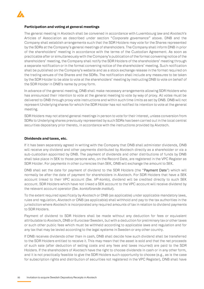 86 Invitation to acquire Swedish Depository Receipts in Alvotech Participation and voting at general meetings The general meeting in Alvotech shall be convened in accordance with Luxembourg law and Alvotech's Articles of Association as described under section “ Corporate governance ” above . DNB and the Company shall establish arrangements such that the SDR Holders may vote for the Shares represented by the SDRs at the Company’s general meetings of shareholders . The Company shall inform DNB in prior of the shareholders’ meeting in accordance with the terms of the Custodian Agreement . As soon as practicable after or simultaneously with the Company’s publication of the formal convening notice of the shareholders’ meeting, the Company shall notify the SDR Holders of the shareholders’ meeting through a separate notification or in the formal convening notice of the shareholders’ meeting . Such notification shall be published on the Company’s website and as a stock exchange release in the format required on the trading venues of the Shares and the SDRs . The notification shall include any measures to be taken by the SDR Holder to be able to vote at the shareholders’ meeting by instructing DNB to vote on behalf of the SDR Holder in DNB’s name by proxy form . In advance of the general meeting, DNB shall make necessary arrangements allowing SDR Holders who has announced their intention to vote at the general meeting to vote by way of proxy . All votes must be delivered to DNB through proxy vote instructions and within such time limits as set by DNB . DNB will not represent Underlying shares for which the SDR Holder has not notified its intention to vote at the general meeting . SDR Holders may not attend general meetings in person to vote for their interest, unless conversion from SDRs to Underlying shares previously represented by such SDRs has been carried out in the local central securities depositary prior thereto, in accordance with the instructions provided by Alvotech . Dividends and taxes, etc . If it has been separately agreed in writing with the Company that DNB shall administer dividends, DNB will receive any dividend and other payments distributed by Alvotech directly as a shareholder or via a sub - custodian appointed by DNB . The payment of dividends and other distributions of funds by DNB shall take place in SEK to those persons who, on the Record Date, are registered in the VPC Register as SDR Holder . For payments in other currencies than SEK, DNB will exchange the amount to SEK . DNB shall set the date for payment of dividend to the SDR Holders (the “Payment Date”) which will normally be after the date of payment for shareholders in Alvotech . For SDR Holders that have a SEK account linked to their VPC account (Sw . VP - konto ), dividend will be credited directly to such SEK account . SDR Holders which have not linked a SEK account to the VPC account will receive dividend by the relevant account operator (Sw . kontoförande institut ) . To the extent required specifically by Alvotech or DNB (as applicable) under applicable mandatory laws, rules and regulation, Alvotech or DNB (as applicable) shall withhold and pay to the tax authorities in the jurisdiction where Alvotech is incorporated any required amounts of tax in relation to dividend payments to SDR Holders . Payment of dividend to SDR Holders shall be made without any deduction for fees or equivalent attributable to Alvotech, DNB or Euroclear Sweden, but with a deduction for preliminary tax or other taxes or such other public fees which must be withheld according to applicable laws and regulation and for any tax that may be levied according to the legal systems in Sweden or any other country . If DNB receives dividends other than in cash, DNB shall decide how such dividend shall be transferred to the SDR Holders entitled to receive it . This may mean that the asset is sold and that the net proceeds of such sale (after deduction of selling costs and any fees and taxes incurred) are paid to the SDR Holders . If the shareholders of Alvotech have the right to choose dividends in cash or in any other form, and it is not practically feasible to give the SDR Holders such opportunity to choose (e . g . , as is the case for subscription rights and distribution of securities not registered in the VPC Register), DNB shall have