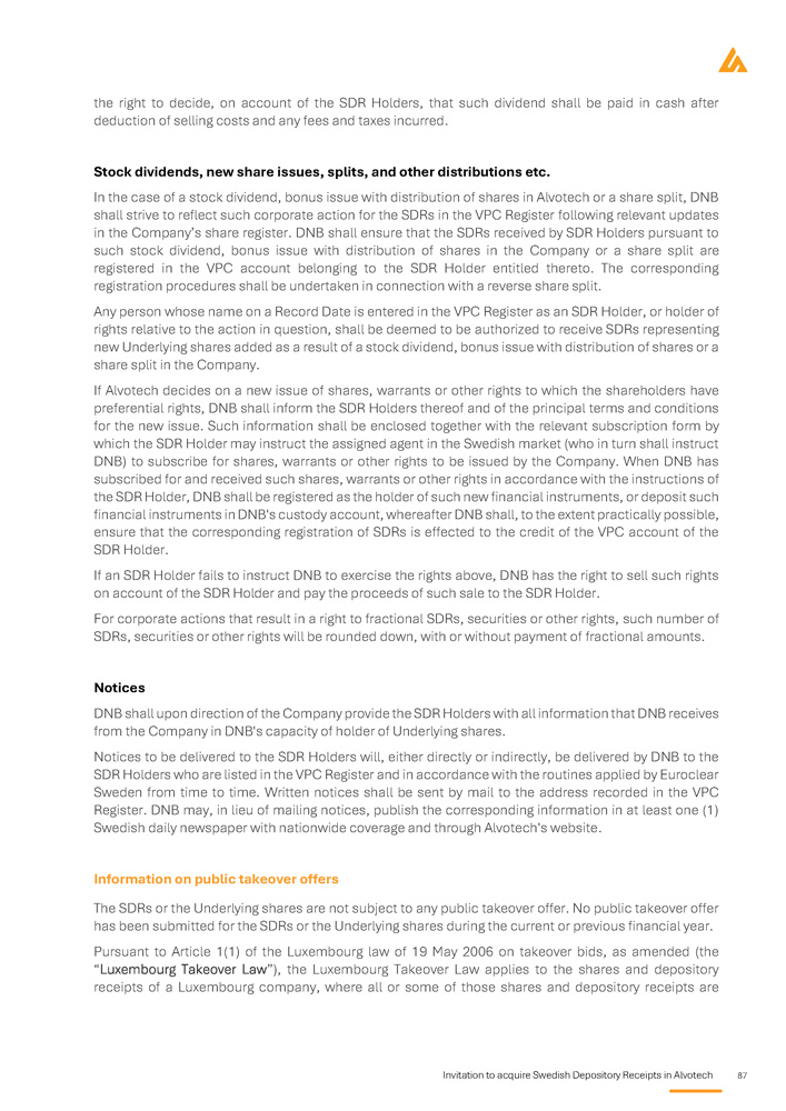 Invitation to acquire Swedish Depository Receipts in Alvotech 87 the right to decide, on account of the SDR Holders, that such dividend shall be paid in cash after deduction of selling costs and any fees and taxes incurred . Stock dividends, new share issues, splits, and other distributions etc . In the case of a stock dividend, bonus issue with distribution of shares in Alvotech or a share split, DNB shall strive to reflect such corporate action for the SDRs in the VPC Register following relevant updates in the Company’s share register . DNB shall ensure that the SDRs received by SDR Holders pursuant to such stock dividend, bonus issue with distribution of shares in the Company or a share split are registered in the VPC account belonging to the SDR Holder entitled thereto . The corresponding registration procedures shall be undertaken in connection with a reverse share split . Any person whose name on a Record Date is entered in the VPC Register as an SDR Holder, or holder of rights relative to the action in question, shall be deemed to be authorized to receive SDRs representing new Underlying shares added as a result of a stock dividend, bonus issue with distribution of shares or a share split in the Company . If Alvotech decides on a new issue of shares, warrants or other rights to which the shareholders have preferential rights, DNB shall inform the SDR Holders thereof and of the principal terms and conditions for the new issue . Such information shall be enclosed together with the relevant subscription form by which the SDR Holder may instruct the assigned agent in the Swedish market (who in turn shall instruct DNB) to subscribe for shares, warrants or other rights to be issued by the Company . When DNB has subscribed for and received such shares, warrants or other rights in accordance with the instructions of the SDR Holder, DNB shall be registered as the holder of such new financial instruments, or deposit such financial instruments in DNB's custody account, whereafter DNB shall, to the extent practically possible, ensure that the corresponding registration of SDRs is effected to the credit of the VPC account of the SDR Holder . If an SDR Holder fails to instruct DNB to exercise the rights above, DNB has the right to sell such rights on account of the SDR Holder and pay the proceeds of such sale to the SDR Holder . For corporate actions that result in a right to fractional SDRs, securities or other rights, such number of SDRs, securities or other rights will be rounded down, with or without payment of fractional amounts . Notices DNB shall upon direction of the Company provide the SDR Holders with all information that DNB receives from the Company in DNB's capacity of holder of Underlying shares . Notices to be delivered to the SDR Holders will, either directly or indirectly, be delivered by DNB to the SDR Holders who are listed in the VPC Register and in accordance with the routines applied by Euroclear Sweden from time to time . Written notices shall be sent by mail to the address recorded in the VPC Register . DNB may, in lieu of mailing notices, publish the corresponding information in at least one ( 1 ) Swedish daily newspaper with nationwide coverage and through Alvotech's website . Information on public takeover offers The SDRs or the Underlying shares are not subject to any public takeover offer . No public takeover offer has been submitted for the SDRs or the Underlying shares during the current or previous financial year . Pursuant to Article 1 ( 1 ) of the Luxembourg law of 19 May 2006 on takeover bids, as amended (the “Luxembourg Takeover Law”), the Luxembourg Takeover Law applies to the shares and depository receipts of a Luxembourg company, where all or some of those shares and depository receipts are