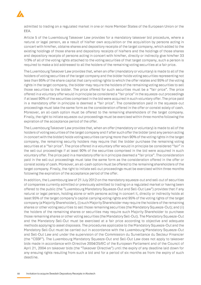 88 Invitation to acquire Swedish Depository Receipts in Alvotech admitted to trading on a regulated market in one or more Member States of the European Union or the EEA . Article 5 of the Luxembourg Takeover Law provides for a mandatory takeover bid procedure, where a natural or legal person, as a result of his/her own acquisition or the acquisition by persons acting in concert with him/her, obtains shares and depository receipts of the target company, which added to the existing holdings of those shares and depository receipts of his/hers and the holdings of those shares and depository receipts of persons acting in concert with him/her, directly or indirectly give him/her 33 1 / 3 % of all of the voting rights attached to the voting securities of that target company, such a person is required to make a bid addressed to all the holders of the remaining voting securities at a fair price . The Luxembourg Takeover Law provides that, when an offer (mandatory or voluntary) is made to all of the holders of voting securities of the target company and the bidder holds voting securities representing not less than 95 % of the share capital that carry voting rights to which the offer relates and 95 % of the voting rights in the target company, the bidder may require the holders of the remaining voting securities to sell those securities to the bidder . The price offered for such securities must be a “fair price” . The price offered in a voluntary offer would in principle be considered a “fair price” in the squeeze - out proceedings if at least 90 % of the securities comprised in the bid were acquired in such voluntary offer . The price paid in a mandatory offer in principle is deemed a “fair price” . The consideration paid in the squeeze - out proceedings must take the same form as the consideration offered in the offer or consist solely of cash . Moreover, an all - cash option must be offered to the remaining shareholders of the target company . Finally, the right to initiate squeeze - out proceedings must be exercised within three months following the expiration of the acceptance period of the offer . The Luxembourg Takeover Law provides that, when an offer (mandatory or voluntary) is made to all of the holders of voting securities of the target company and if after such offer the bidder (and any person acting in concert with the bidder) holds voting securities carrying more than 90 % of the voting rights in the target company, the remaining security holders may require that the bidder purchase the remaining voting securities at a “fair price” . The price offered in a voluntary offer would in principle be considered “fair” in the sell - out proceedings if at least 90 % of the securities comprised in the bid were acquired in such voluntary offer . The price paid in a mandatory offer is in principle deemed a “fair price” . The consideration paid in the sell - out proceedings must take the same form as the consideration offered in the offer or consist solely of cash . Moreover, an all - cash option must be offered to the remaining shareholders of the target company . Finally, the right to initiate sell - out proceedings must be exercised within three months following the expiration of the acceptance period of the offer . In addition, the Luxembourg law of 21 July 2012 on the mandatory squeeze - out and sell - out of securities of companies currently admitted or previously admitted to trading on a regulated market or having been offered to the public (the ”Luxembourg Mandatory Squeeze - Out and Sell - Out Law”) provides that if any natural or legal person, holding alone or with persons acting in concert it, directly or indirectly holds at least 95 % of the target company’s capital carrying voting rights and 95 % of the voting rights of the target company (a Majority Shareholder), (i) such Majority Shareholder may require the holders of the remaining shares or other voting securities to sell those remaining securities (the Mandatory Squeeze - Out) ; and (ii) the holders of the remaining shares or securities may require such Majority Shareholder to purchase those remaining shares or other voting securities (the Mandatory Sell - Out) . The Mandatory Squeeze - Out and the Mandatory Sell - Out must be exercised at a fair price according to objective and adequate methods applying to asset disposals . The procedures applicable to the Mandatory Squeeze - Out and the Mandatory Sell - Out must be carried out in accordance with the Luxembourg Mandatory Squeeze - Out and Sell - Out Law and under the supervision of the Commission du Surveillance du Secteur Financier (the “CSSF”) . The Luxembourg Mandatory Squeeze - Out and Sell - Out Law does not apply to takeover bids made in accordance with Directive 2004 / 25 /EC of the European Parliament and of the Council of April 21 , 2004 on takeover bids (the “Takeover Directive”) until the expiry of any deadline laid down for any ensuing rights resulting from such a bid and for a period of six months as from the expiry of such deadline .