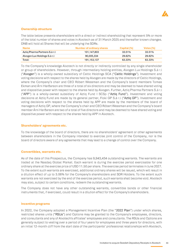 Invitation to acquire Swedish Depository Receipts in Alvotech 89 Ownership structure The table below presents shareholders with a direct or indirect shareholding that represent 5 % or more of the total number of shares and votes in Alvotech as of 31 March 2025 and thereafter known changes . DNB will hold all Shares that will be underlying the SDRs . Votes (%) Capital (%) Number of ordinary shares Name 33.51% 33.51% 101,147,803 Aztiq Pharma Partners S.à r.l 29.82% 29.82% 90,005,334 Alvogen Lux Holdings S.à r.l 63.33% 63.33% 191,153,137 Total: To the Company’s knowledge Alvotech is not directly or indirectly controlled by any single shareholder or group of shareholders . However, through intermediary holding entities, Alvogen Lux Holdings S . à r . l (“Alvogen”) is a wholly - owned subsidiary of Celtic Holdings SCA (“Celtic Holdings”) . Investment and voting decisions with respect to the shares held by Alvogen are made by the directors of Celtic Holdings, where the Company’s chair and CEO Róbert Wessman and the Company’s board members Tomas Ekman and Árni Harðarson are three of a total of six directors and may be deemed to have shared voting and dispositive power with respect to the shares held by Alvogen . Further, Aztiq Pharma Partners S . à r . l (“APP”) is a wholly - owned subsidiary of Aztiq Fund I SCSp (“Aztiq Fund”) . Investment and voting decisions at Aztiq Fund are made by its general partner, Floki GP S . à r . l (“Aztiq GP”) . Investment and voting decisions with respect to the shares held by APP are made by the members of the board of managers of Aztiq GP, where the Company’s chair and CEO Róbert Wessman and the Company’s board member Árni Harðarson are two of a total of five directors and may be deemed to have shared voting and dispositive power with respect to the shares held by APP in Alvotech . Shareholders' agreements etc. To the knowledge of the board of directors, there are no shareholders' agreement or other agreements between shareholders in the Company intended to exercise joint control of the Company, nor is the board of directors aware of any agreements that may lead to a change of control over the Company . Convertibles, warrants etc. As of the date of this Prospectus, the Company has 9 , 943 , 434 outstanding warrants . The warrants are traded at the Nasdaq Global Market . Each warrant is during the exercise period exercisable for one ordinary share at the exercise price of USD 11 . 50 per share . The exercise period terminates in June 2027 . To the extent such warrants are exercised, additional ordinary shares will be issued, which will result in a dilution effect of up to 3 . 06 % for the Company's shareholders and SDR Holders . To the extent such warrants are not exercised by the end of the exercise period, such warrants shall become void . Alvotech may also, subject to certain conditions, redeem the outstanding warrants . The Company does not have any other outstanding warrants, convertible bonds or other financial instruments that, if exercised, could result in a dilution effect for the Company's shareholders . Incentive programs In 2022 , the Company adopted a Management Incentive Plan (the “ 2022 Plan”) under which shares, restricted shares units (“RSUs”) and Options may be granted to the Company's employees, directors, and consultants and any of Alvotech's affiliates’ employees and consultants . The RSUs and Options are generally subject to vesting over a period of four years for employees and three years for directors, with an initial 12 - month cliff from the start date of the participants’ professional relationships with Alvotech,