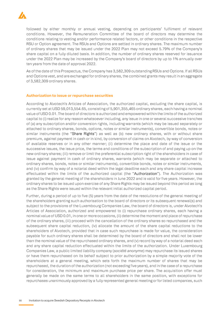 90 Invitation to acquire Swedish Depository Receipts in Alvotech followed by either monthly or annual vesting, depending on participants’ fulfilment of relevant conditions . However, the Remuneration Committee of the board of directors may determine the conditions relating to vesting and/or performance related factors, or other conditions in the respective RSU or Option agreement . The RSUs and Options are settled in ordinary shares . The maximum number of ordinary shares that may be issued under the 2022 Plan may not exceed 5 . 79 % of the Company's share capital on a fully diluted basis . In addition, the number of ordinary shares reserved for issuance under the 2022 Plan may be increased by the Company's board of directors by up to 1 % annually over ten years from the date of approval 2022 . As of the date of this Prospectus, the Company has 3 , 582 , 309 outstanding RSUs and Options . If all RSUs and Options vest, and are exchanged for ordinary shares, the combined grants may result in an aggregate of 3 , 582 , 309 ordinary shares . Authorization to issue or repurchase securities According to Alvotech's Articles of Association, the authorized capital, excluding the share capital, is currently set at USD 59 , 013 , 554 . 65 , consisting of 5 , 901 , 355 , 465 ordinary shares, each having a nominal value of USD 0 . 01 . The board of directors is authorized and empowered within the limits of the authorized capital to (i) realize for any reason whatsoever including, any issue in one or several successive tranches of (a) any subscription and/or conversion rights, including warrants (which may be issued separately or attached to ordinary shares, bonds, options, notes or similar instruments), convertible bonds, notes or similar instruments (the “Share Rights”) as well as (b) new ordinary shares, with or without share premium, against payment in cash or in kind, by conversion of claims on Alvotech, by way of conversion of available reserves or in any other manner ; (ii) determine the place and date of the issue or the successive issues, the issue price, the terms and conditions of the subscription of and paying up on the new ordinary shares ; (iii) remove or limit the preferential subscription right of the shareholders in case of issue against payment in cash of ordinary shares, warrants (which may be separate or attached to ordinary shares, bonds, notes or similar instruments), convertible bonds, notes or similar instruments, and (iv) confirm by way of a notarial deed within the legal deadline each and any share capital increase effectuated within the limits of the authorized capital (the “Authorization”) . The Authorization was granted by the general meeting of the shareholders in June 2022 and is valid for five years . However, the ordinary shares to be issued upon exercise of any Share Rights may be issued beyond this period as long as the Share Rights were issued within the relevant initial authorized capital period . Further, during a period of up to five ( 5 ) years from the date of the resolutions of the general meeting of the shareholders granting such authorisation to the board of directors or its subsequent renewal(s) and subject to the provisions of the Luxembourg Companies Law, the board of directors is, under Alvotech's Articles of Association, authorized and empowered to (i) repurchase ordinary shares, each having a nominal value of USD 0 . 01 , in one or more occasions, (ii) determine the moment and place of repurchase of the ordinary shares, (iii) proceed with the cancellation of the ordinary shares so repurchased and the subsequent share capital reduction, (iv) allocate the amount of the share capital reductions to the shareholders of Alvotech, provided that in case such repurchase is made for value, the consideration payable for such ordinary shares shall be determined by the board of directors and shall not be lower than the nominal value of the repurchased ordinary shares, and (v) record by way of a notarial deed each and any share capital reduction effectuated within the limits of the authorization . Under Luxembourg Companies Law, a public limited liability company ( société anonyme ) may repurchase its issued shares or have them repurchased on its behalf subject to prior authorization by a simple majority vote of the shareholders at a general meeting, which sets forth the maximum number of shares that may be repurchased, the duration of the authorization (not exceeding five years), and in the case of a repurchase for consideration, the minimum and maximum purchase price per share . The acquisition offer must generally be made on the same terms to all shareholders in the same position, with exceptions for repurchases unanimously approved by a fully represented general meeting or for listed companies, such