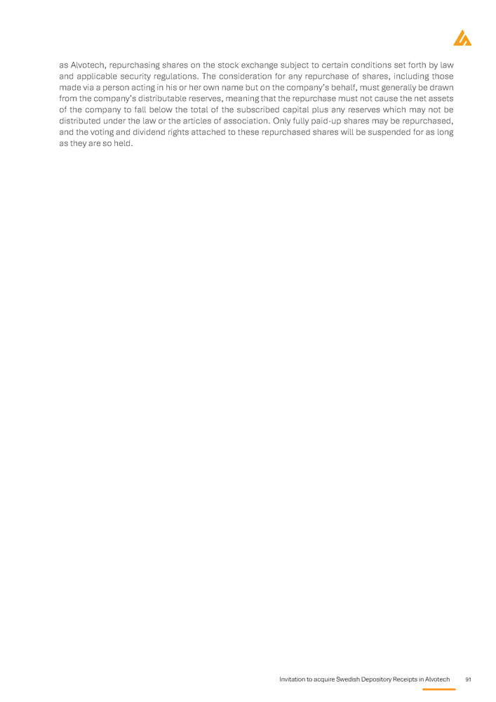 Invitation to acquire Swedish Depository Receipts in Alvotech 91 as Alvotech, repurchasing shares on the stock exchange subject to certain conditions set forth by law and applicable security regulations . The consideration for any repurchase of shares, including those made via a person acting in his or her own name but on the company’s behalf, must generally be drawn from the company’s distributable reserves, meaning that the repurchase must not cause the net assets of the company to fall below the total of the subscribed capital plus any reserves which may not be distributed under the law or the articles of association . Only fully paid - up shares may be repurchased, and the voting and dividend rights attached to these repurchased shares will be suspended for as long as they are so held .