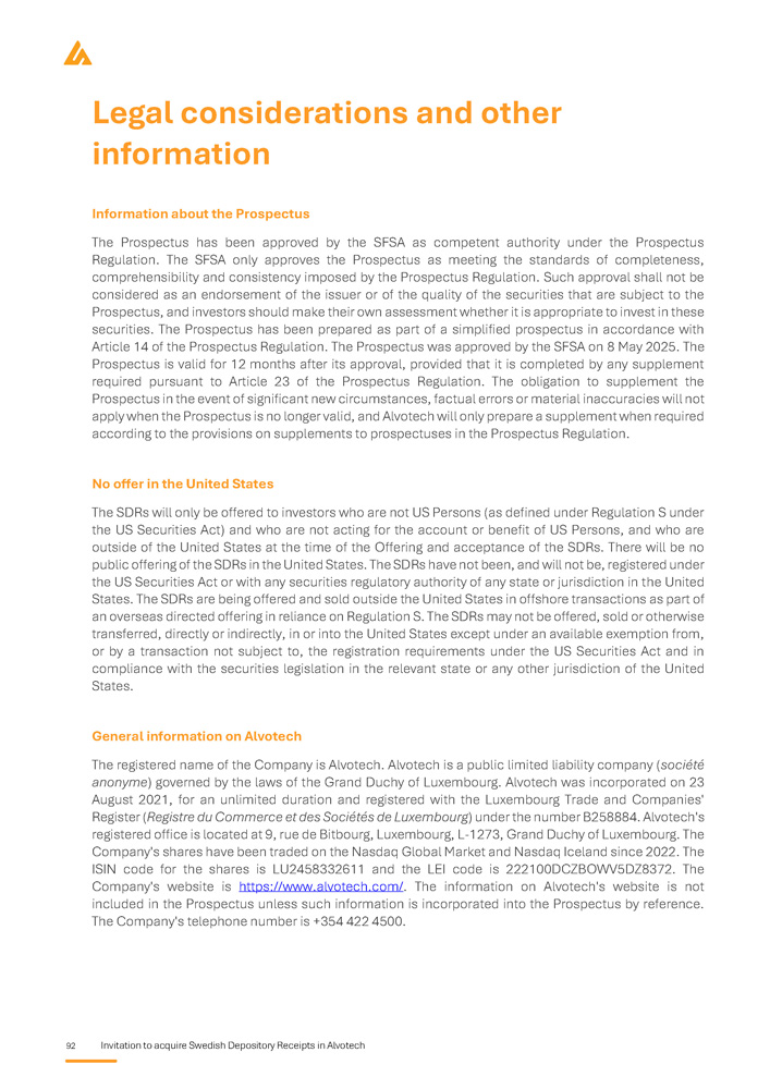 92 Invitation to acquire Swedish Depository Receipts in Alvotech Legal considerations and other information Information about the Prospectus The Prospectus has been approved by the SFSA as competent authority under the Prospectus Regulation . The SFSA only approves the Prospectus as meeting the standards of completeness, comprehensibility and consistency imposed by the Prospectus Regulation . Such approval shall not be considered as an endorsement of the issuer or of the quality of the securities that are subject to the Prospectus, and investors should make their own assessment whether it is appropriate to invest in these securities . The Prospectus has been prepared as part of a simplified prospectus in accordance with Article 14 of the Prospectus Regulation . The Prospectus was approved by the SFSA on 8 May 2025 . The Prospectus is valid for 12 months after its approval, provided that it is completed by any supplement required pursuant to Article 23 of the Prospectus Regulation . The obligation to supplement the Prospectus in the event of significant new circumstances, factual errors or material inaccuracies will not apply when the Prospectus is no longer valid, and Alvotech will only prepare a supplement when required according to the provisions on supplements to prospectuses in the Prospectus Regulation . No offer in the United States The SDRs will only be offered to investors who are not US Persons (as defined under Regulation S under the US Securities Act) and who are not acting for the account or benefit of US Persons, and who are outside of the United States at the time of the Offering and acceptance of the SDRs . There will be no public offering of the SDRs in the United States . The SDRs have not been, and will not be, registered under the US Securities Act or with any securities regulatory authority of any state or jurisdiction in the United States . The SDRs are being offered and sold outside the United States in offshore transactions as part of an overseas directed offering in reliance on Regulation S . The SDRs may not be offered, sold or otherwise transferred, directly or indirectly, in or into the United States except under an available exemption from, or by a transaction not subject to, the registration requirements under the US Securities Act and in compliance with the securities legislation in the relevant state or any other jurisdiction of the United States . General information on Alvotech The registered name of the Company is Alvotech . Alvotech is a public limited liability company ( société anonyme ) governed by the laws of the Grand Duchy of Luxembourg . Alvotech was incorporated on 23 August 2021 , for an unlimited duration and registered with the Luxembourg Trade and Companies' Register ( Registre du Commerce et des Sociétés de Luxembourg ) under the number B 258884 . Alvotech's registered office is located at 9 , rue de Bitbourg, Luxembourg, L - 1273 , Grand Duchy of Luxembourg . The Company's shares have been traded on the Nasdaq Global Market and Nasdaq Iceland since 2022 . The ISIN code for the shares is LU 2458332611 and the LEI code is 222100 DCZBOWV 5 DZ 8372 . The Company's website is https : //www . alvotech . com/ . The information on Alvotech's website is not included in the Prospectus unless such information is incorporated into the Prospectus by reference . The Company's telephone number is + 354 422 4500 .