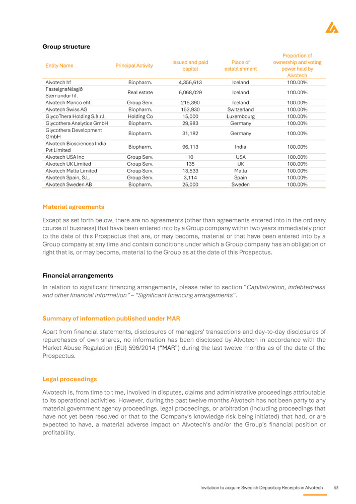 Invitation to acquire Swedish Depository Receipts in Alvotech 93 Group structure Proportion of ownership and voting power held by Alvotech Place of establishment Issued and paid capital Principal Activity Entity Name 100.00% Iceland 4,356,613 Biopharm. Alvotech hf 100.00% Iceland 6,068,029 Real estate Fasteignafélagið Sæmundur hf. 100.00% Iceland 215,390 Group Serv. Alvotech Manco ehf. 100.00% Switzerland 153,930 Biopharm. Alvotech Swiss AG 100.00% Luxembourg 15,000 Holding Co GlycoThera Holding S.à.r.l. 100.00% Germany 29,983 Biopharm. Glycothera Analytics GmbH 100.00% Germany 31,182 Biopharm. Glycothera Development GmbH 100.00% India 96,113 Biopharm. Alvotech Biosciences India Pvt Limited 100.00% USA 10 Group Serv. Alvotech USA Inc 100.00% UK 135 Group Serv. Alvotech UK Limited 100.00% Malta 13,533 Group Serv. Alvotech Malta Limited 100.00% Spain 3,114 Group Serv. Alvotech Spain, S.L. 100.00% Sweden 25,000 Biopharm. Alvotech Sweden AB Material agreements Except as set forth below, there are no agreements (other than agreements entered into in the ordinary course of business) that have been entered into by a Group company within two years immediately prior to the date of this Prospectus that are, or may become, material or that have been entered into by a Group company at any time and contain conditions under which a Group company has an obligation or right that is, or may become, material to the Group as at the date of this Prospectus . Financial arrangements In relation to significant financing arrangements, please refer to section “ Capitalization, indebtedness and other financial information” – “Significant financing arrangements ” . Summary of information published under MAR Apart from financial statements, disclosures of managers' transactions and day - to - day disclosures of repurchases of own shares, no information has been disclosed by Alvotech in accordance with the Market Abuse Regulation (EU) 596 / 2014 (“MAR”) during the last twelve months as of the date of the Prospectus . Legal proceedings Alvotech is, from time to time, involved in disputes, claims and administrative proceedings attributable to its operational activities . However, during the past twelve months Alvotech has not been party to any material government agency proceedings, legal proceedings, or arbitration (including proceedings that have not yet been resolved or that to the Company's knowledge risk being initiated) that had, or are expected to have, a material adverse impact on Alvotech's and/or the Group's financial position or profitability .