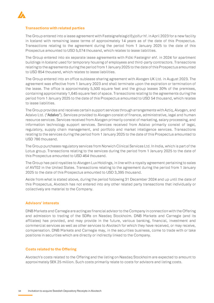 94 Invitation to acquire Swedish Depository Receipts in Alvotech Transactions with related parties The Group entered into a lease agreement with Fasteignafelagid Eyjolfur hf . in April 2023 for a new facility in Iceland with remaining lease terms of approximately 14 years as of the date of this Prospectus . Transactions relating to the agreement during the period from 1 January 2025 to the date of this Prospectus amounted to USD 5 , 074 thousand, which relates to lease liabilities . The Group entered into six separate lease agreements with Flóki Fasteignir ehf . in 2024 for apartment buildings in Iceland used for temporary housing of employees and third - party contractors . Transactions relating to the agreements during the period from 1 January 2025 to the date of this Prospectus amounted to USD 854 thousand, which relates to lease liabilities . The Group entered into an office sublease sharing agreement with Alvogen UK Ltd . in August 2023 . The agreement was effective from 1 January 2023 and shall terminate upon the expiration or termination of the lease . The office is approximately 5 , 500 square feet and the group leases 30 % of the premises, containing approximately 1 , 645 square feet of space . Transactions relating to the agreements during the period from 1 January 2025 to the date of this Prospectus amounted to USD 54 thousand, which relates to lease liabilities . The Group provides and receives certain support services through arrangements with Aztiq, Alvogen, and Adalvo Ltd . (“Adalvo”) . Services provided to Alvogen consist of finance, administrative, legal and human resource services . Services received from Alvogen primarily consist of marketing, salary processing, and information technology support services . Services received from Adalvo primarily consist of legal, regulatory, supply chain management, and portfolio and market intelligence services . Transactions relating to the services during the period from 1 January 2025 to the date of this Prospectus amounted to USD 786 thousand . The Group purchases regulatory services from Norwich Clinical Services Ltd . In India, which is part of the Lotus group . Transactions relating to the services during the period from 1 January 2025 to the date of this Prospectus amounted to USD 464 thousand . The Group has paid royalties to Alvogen Lux Holdings, in line with a royalty agreement pertaining to sales of AVT 02 in the United States . Transactions relating to the agreement during the period from 1 January 2025 to the date of this Prospectus amounted to USD 3 , 395 thousand . Aside from what is stated above, during the period following 31 December 2024 and up until the date of this Prospectus, Alvotech has not entered into any other related party transactions that individually or collectively are material to the Company . Advisors' interests DNB Markets and Carnegie are acting as financial advisor to the Company in connection with the Offering and admission to trading of the SDRs on Nasdaq Stockholm . DNB Markets and Carnegie (and its affiliates) has provided, and may provide in the future, various banking, financial, investment and commercial services as well as other services to Alvotech for which they have received, or may receive, compensation . DNB Markets and Carnegie may, in the securities business, come to trade with or take positions in securities which are directly or indirectly linked to the Company . Costs related to the Offering Alvotech's costs related to the Offering and the listing on Nasdaq Stockholm are expected to amount to approximately SEK 25 million . Such costs primarily relate to costs for advisors and listing costs .