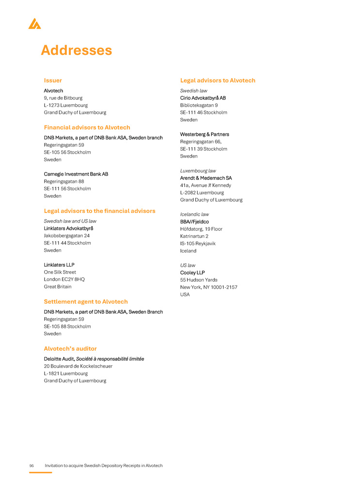 96 Invitation to acquire Swedish Depository Receipts in Alvotech Addresses Legal advisors to Alvotech Swedish law Cirio Advokatbyrå AB Biblioteksgatan 9 SE - 111 46 Stockholm Sweden Westerberg & Partners Regeringsgatan 66, SE - 111 39 Stockholm Sweden Luxembourg law Arendt & Medernach SA 41a, Avenue Jf Kennedy L - 2082 Luxembourg Grand Duchy of Luxembourg Icelandic law BBA//Fjeldco Höfdatorg, 19 Floor Katrinartun 2 IS - 105 Reykjavik Iceland US law Cooley LLP 55 Hudson Yards New York, NY 10001 - 2157 USA Issuer Alvotech 9, rue de Bitbourg L - 1273 Luxembourg Grand Duchy of Luxembourg Financial advisors to Alvotech DNB Markets, a part of DNB Bank ASA, Sweden branch Regeringsgatan 59 SE - 105 56 Stockholm Sweden Carnegie Investment Bank AB Regeringsgatan 88 SE - 111 56 Stockholm Sweden Legal advisors to the financial advisors Swedish law and US law Linklaters Advokatbyrå Jakobsbergsgatan 24 SE - 111 44 Stockholm Sweden Linklaters LLP One Silk Street London EC2Y 8HQ Great Britain Settlement agent to Alvotech DNB Markets, a part of DNB Bank ASA, Sweden Branch Regeringsgatan 59 SE - 105 88 Stockholm Sweden Alvotech’s auditor Deloitte Audit, Société à responsabilité limitée 20 Boulevard de Kockelscheuer L - 1821 Luxembourg Grand Duchy of Luxembourg